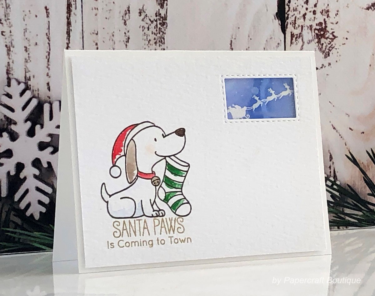 ReplyDeleteThis pup is adorable, Hideko! I think you've colored him and his stocking perfectly! Love the little aperture with Santa and his sleigh! A fun detail!